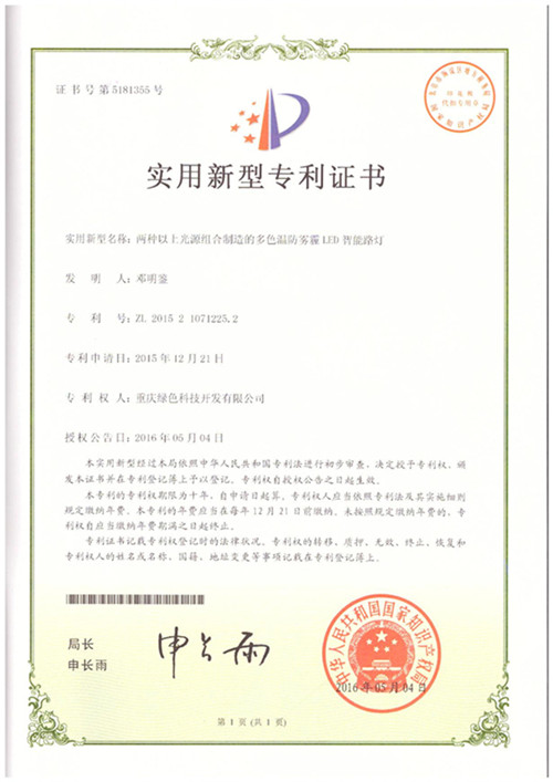 Our R & D of "more than two kinds of light source combination manufacturing multi-color temperature anti haze, LED smart street lamp" on December 2015 21 to the State Patent Office filed a patent. In May 2016, 4, the State Patent Office approved the patent granted (patent number: 201521071225.2). This patent has stimulated the enthusiasm of all employees in the company's scientific and technological innovation. Our company will make persistent efforts to continue to do a good job in scientific and technological innovation work, to bring forth the new, to obtain more patents.