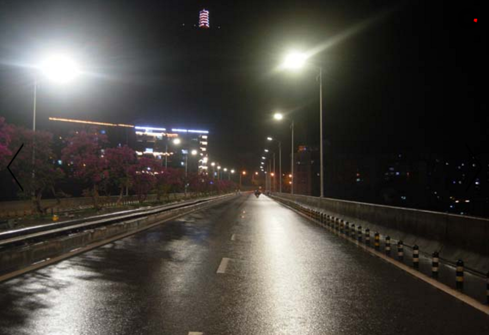 重慶綠色科技開發(集團)有限公司在重慶市巫山縣迎賓大道大橋路段采取合同能源管理方式實施了 110W “十惠牌”LED智能路燈替換250W 鈉燈節能改造項目,主要具有路面燈光清晰度高(顯指70)、均勻度好、光效高等特點,該燈具性能指標均領先全國同類產品,采用我司自主研發的專利技術“互聯網+多色溫LED路燈、隧道燈六遙(多色溫、遙調、遙測、遙控、遙視、遙信)控制系統”(專利號:2015204938054)遙控可實現智能控制。本產品是我司利用多項自主專利技術(專利號:201320842388、201320028126、2015204938054)研發、制造的LED智能路燈產品,并已獲得“重慶市高新技術產品”、“重慶市市政行業新技術認證”。雨天夜間案例實景照片展示如下(2015年6月2日):