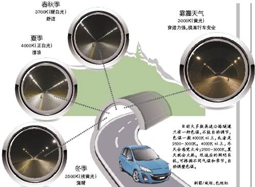 “在不同氣溫和季節,照明系統可根據隧道外光線自動調整色溫,以提高駕乘舒適度。”重慶綠色開發有限公司的法人代表蘇承勇介紹(具體情況如右圖)。這也降低了隧道內事故發生率,且還節能。該技術是重慶綠色開發有限公司與重慶房地產職業學院聯合研發的,具有自主知識產權,填補了我國高速公路隧道照明領域的空白。