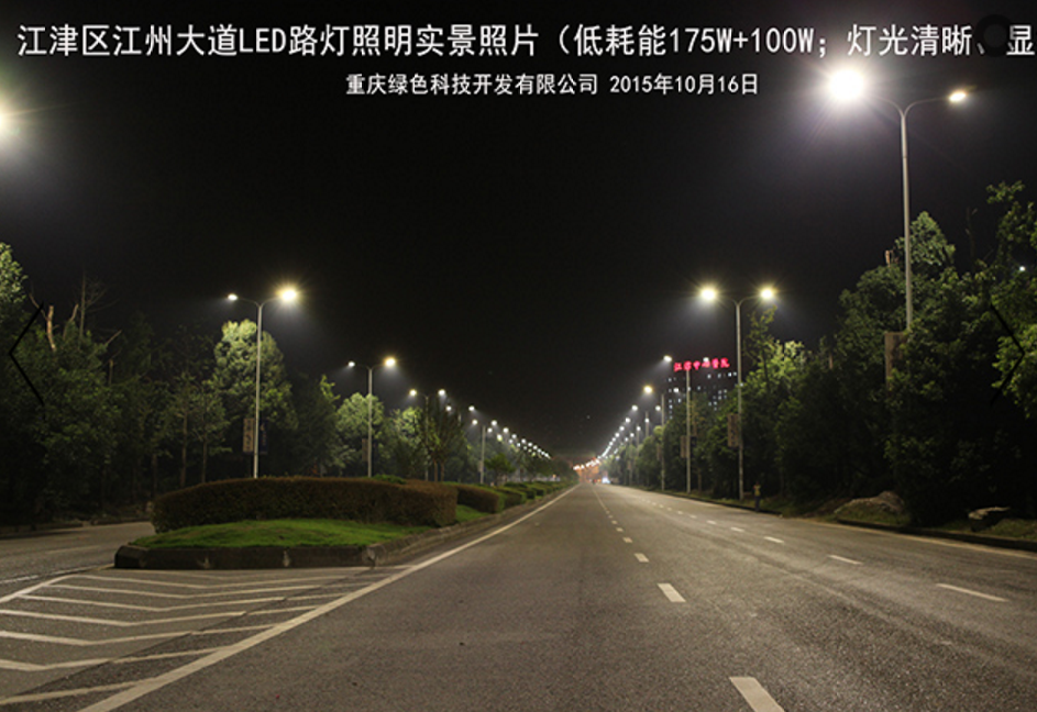 重慶城建經濟(集團)重慶綠色科技開發(集團)有限公司對江津區江州大道實施的175W+100W“十惠牌”LED智能路燈替換440W+275W鈉燈節能改造項目,主要具有路面燈光清晰度高(顯指70)、均勻度好、光效高等特點,該燈具性能指標均領先全國同類產品,若配用我司自主研發的專利技術“互聯網+多色溫LED路燈、隧道燈六遙(多色溫、遙調、遙測、遙控、遙視、遙信)控制系統”(專利號:2015204938054)可實現智能控制。本產品是我司利用多項自主專利技術(專利號:201320842388、201320028126、2015204938054)研發、制造的LED智能路燈產品,并已獲得“重慶市高新技術產品”、“重慶市市政行業新技術認證”。案例實景照片展示如下(2015年10月16日):