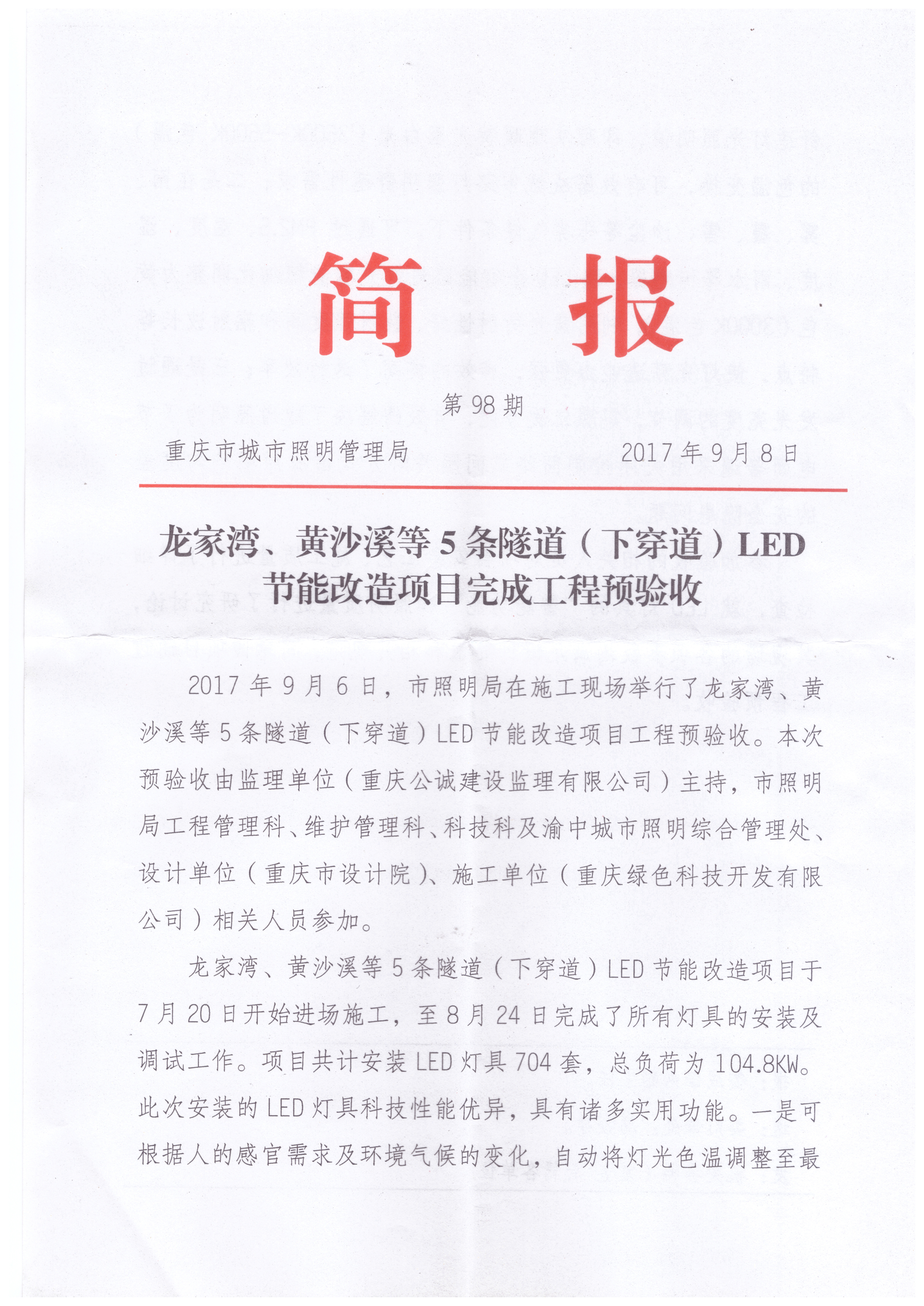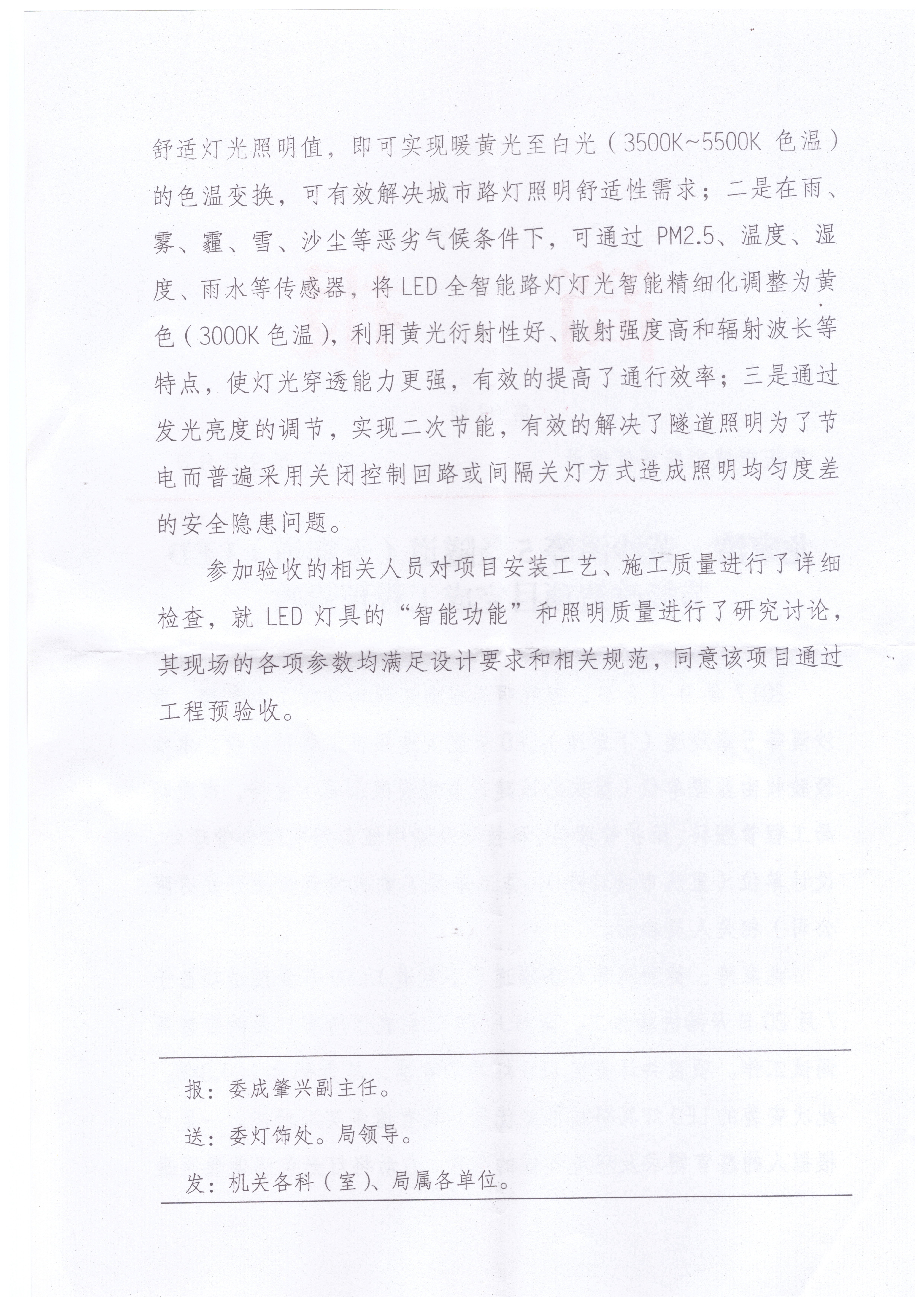 2017年7月31日,我司使用“中國創(chuàng)造”“互聯(lián)網(wǎng)+”多色溫防霧霾LED全智能路燈在重慶市龍家灣、黃沙溪、袁家崗、鵝嶺、陳家坪隧道實(shí)施科技節(jié)能改造工程已全面竣工。2017年9月6日,該項(xiàng)目建設(shè)單位重慶市城市照明管理局、監(jiān)理公司及設(shè)計(jì)公司對該項(xiàng)目進(jìn)行了現(xiàn)場預(yù)驗(yàn)收,參會(huì)人員對該創(chuàng)新專利產(chǎn)品作出了極高的評價(jià)。會(huì)后,重慶市城市照明管理局專門印發(fā)了《龍家灣、黃沙溪等5條隧道(下穿道)LED節(jié)能改造項(xiàng)目完成工程預(yù)驗(yàn)收》簡報(bào)(附后),其上級主管部門重慶市城市管理委員會(huì)對其進(jìn)行了新聞報(bào)道。