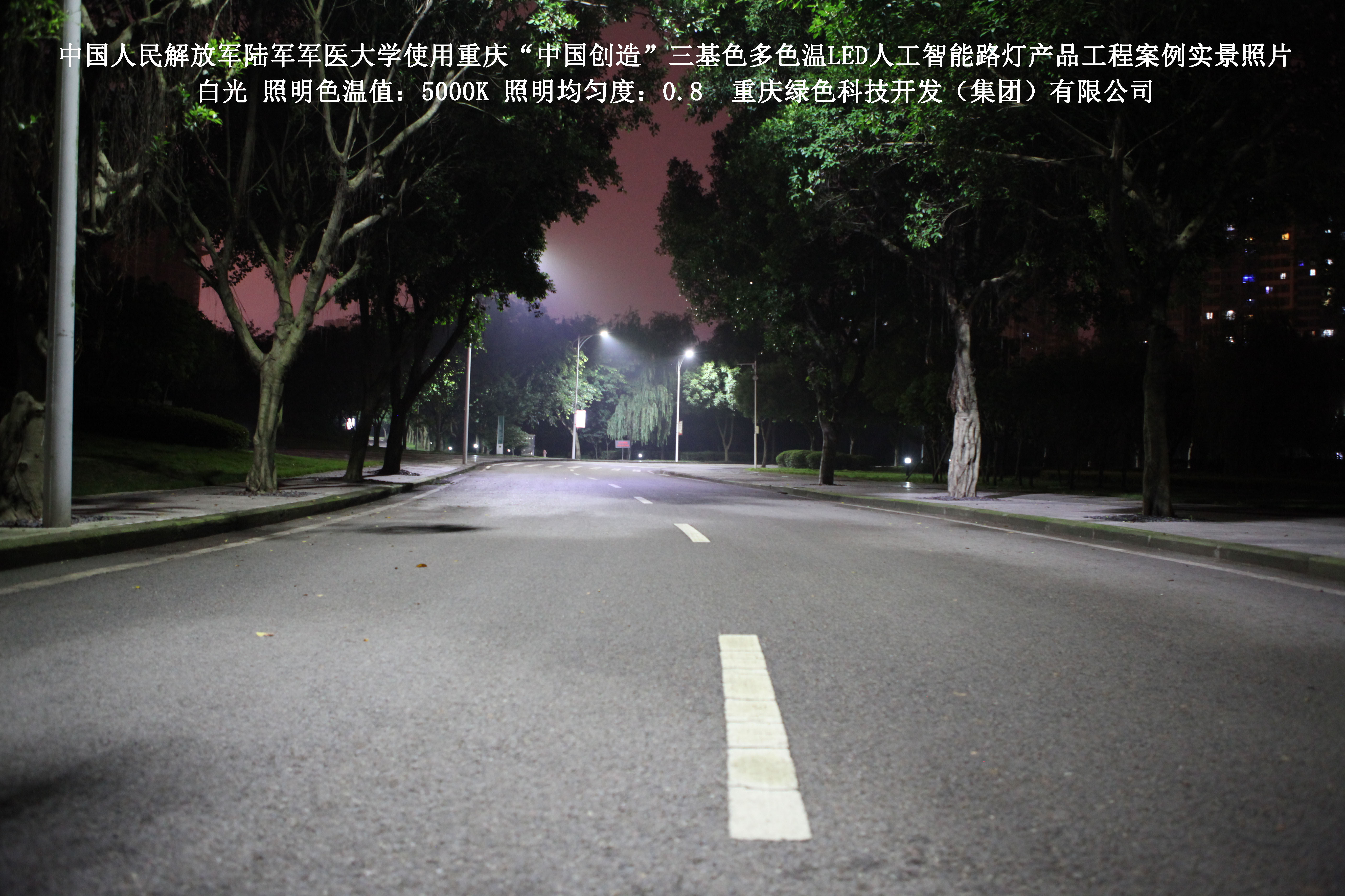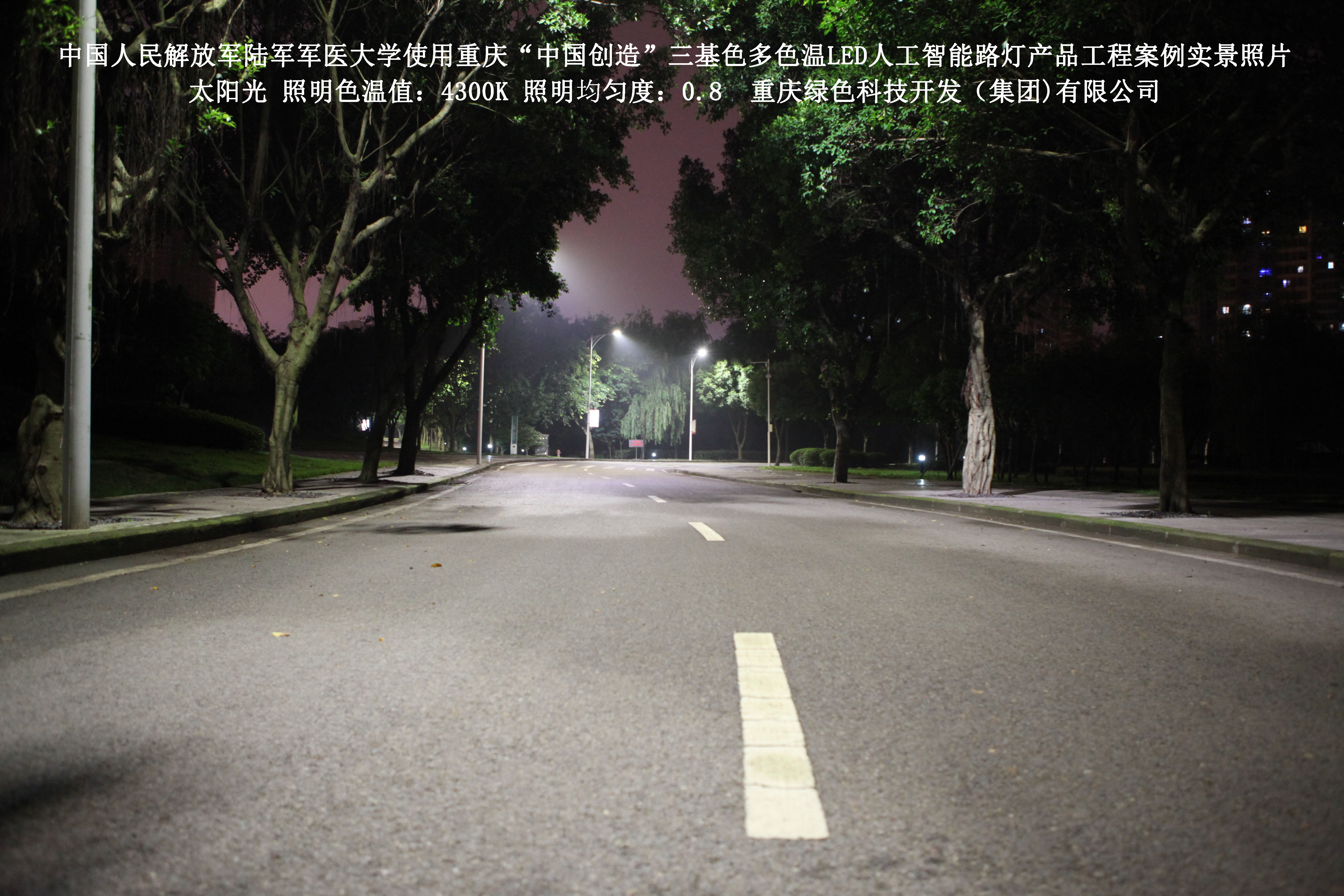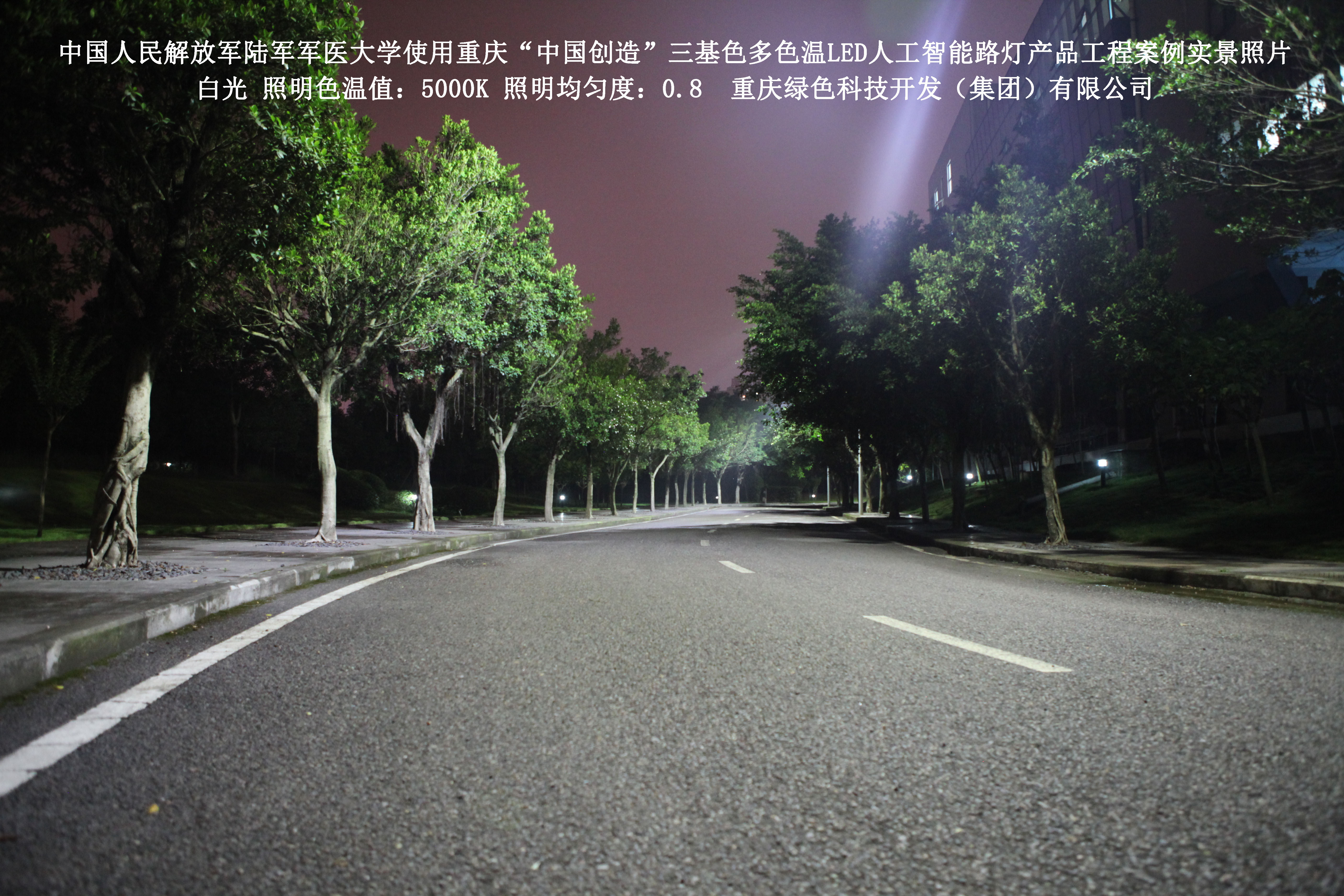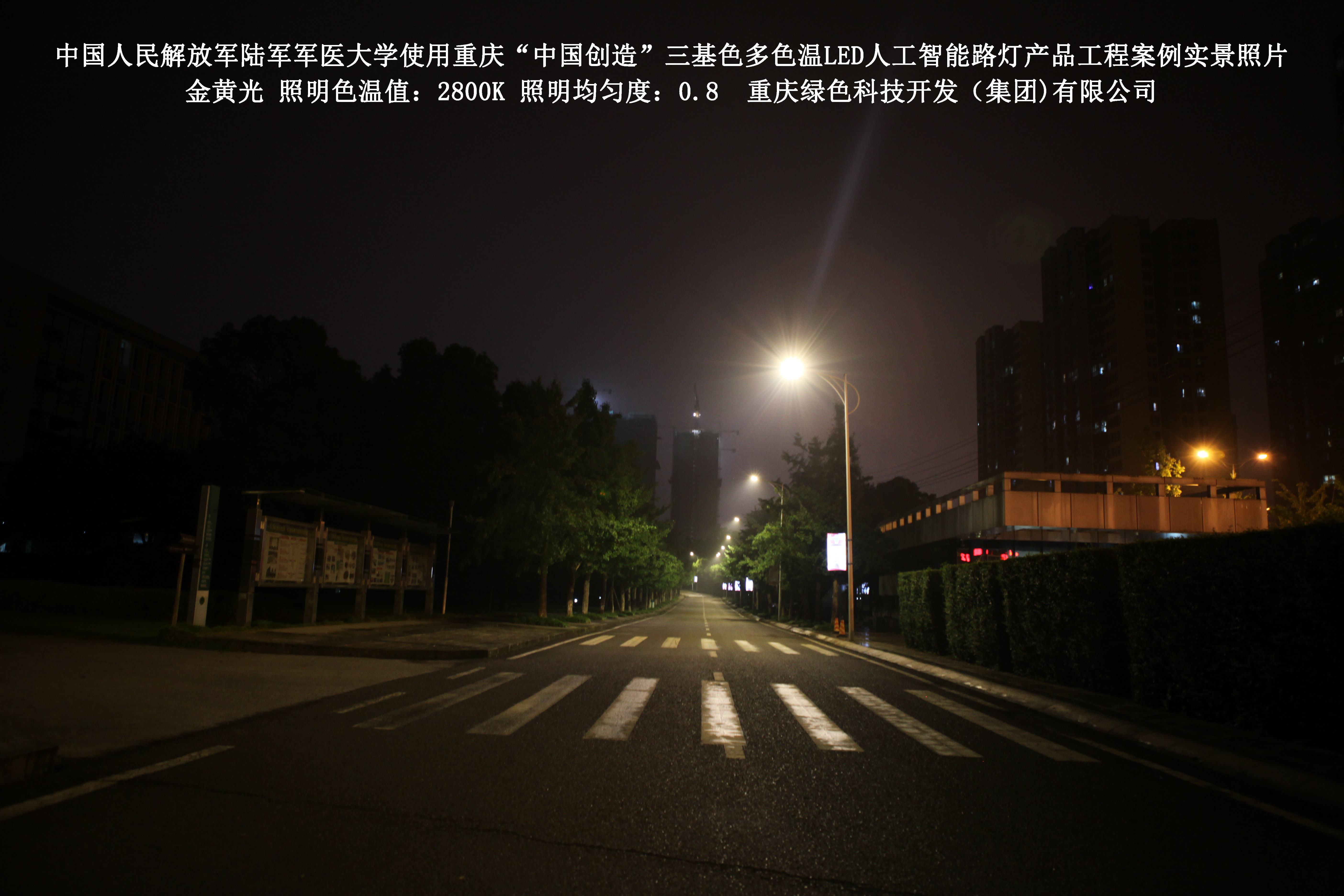 2018年4月,中國人民解放軍陸軍軍醫大學使用了我司研發制造的重慶“中國創造”三基色多色溫LED人工智能路燈,對沙坪壩大學城校區道路實施了綠色照明科技節能改造工程,該工程已全面竣工。工程實施后,極大地提高了照明清晰度、燈光均勻度、舒適度,實現城市路燈照明系統的智能化管理。