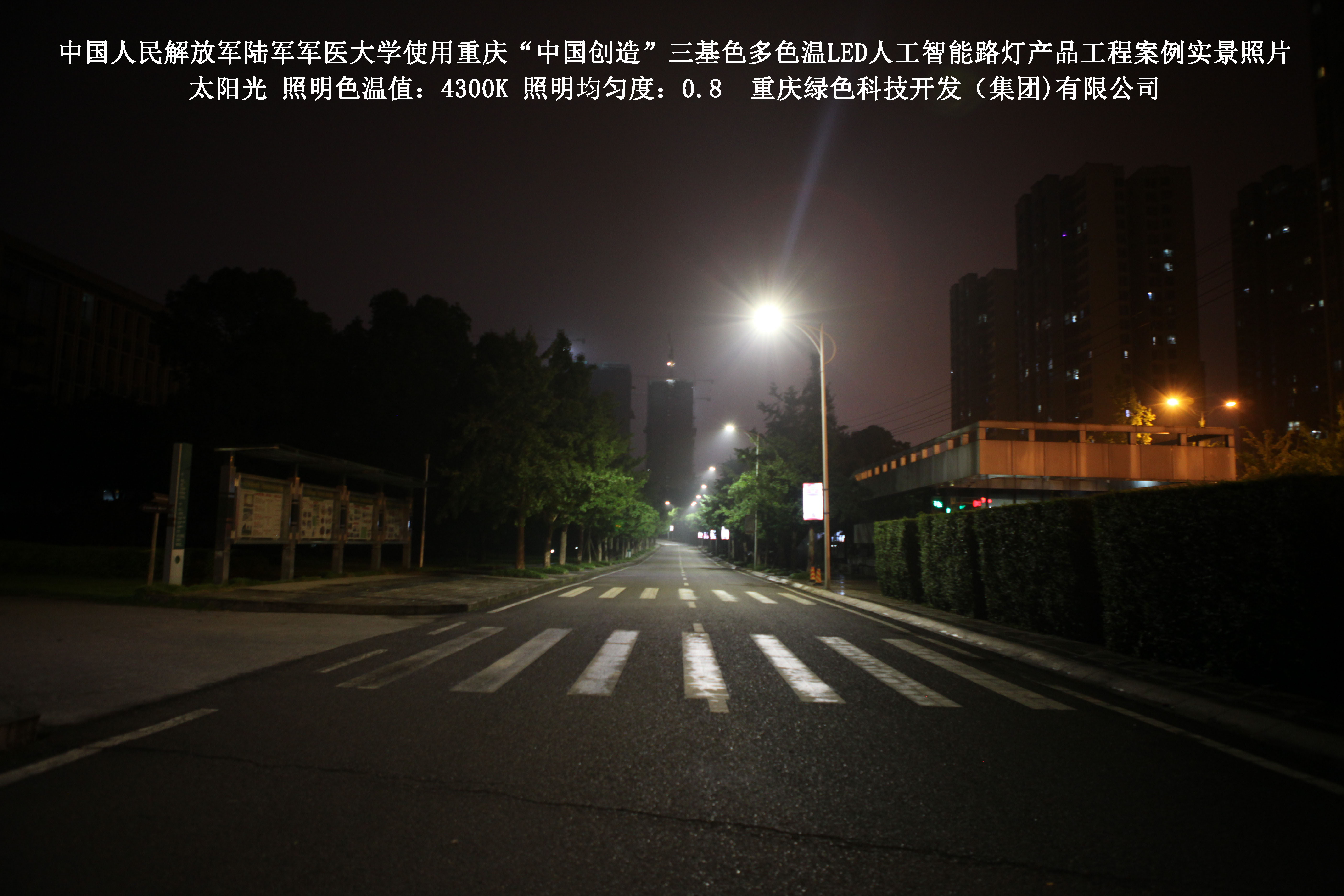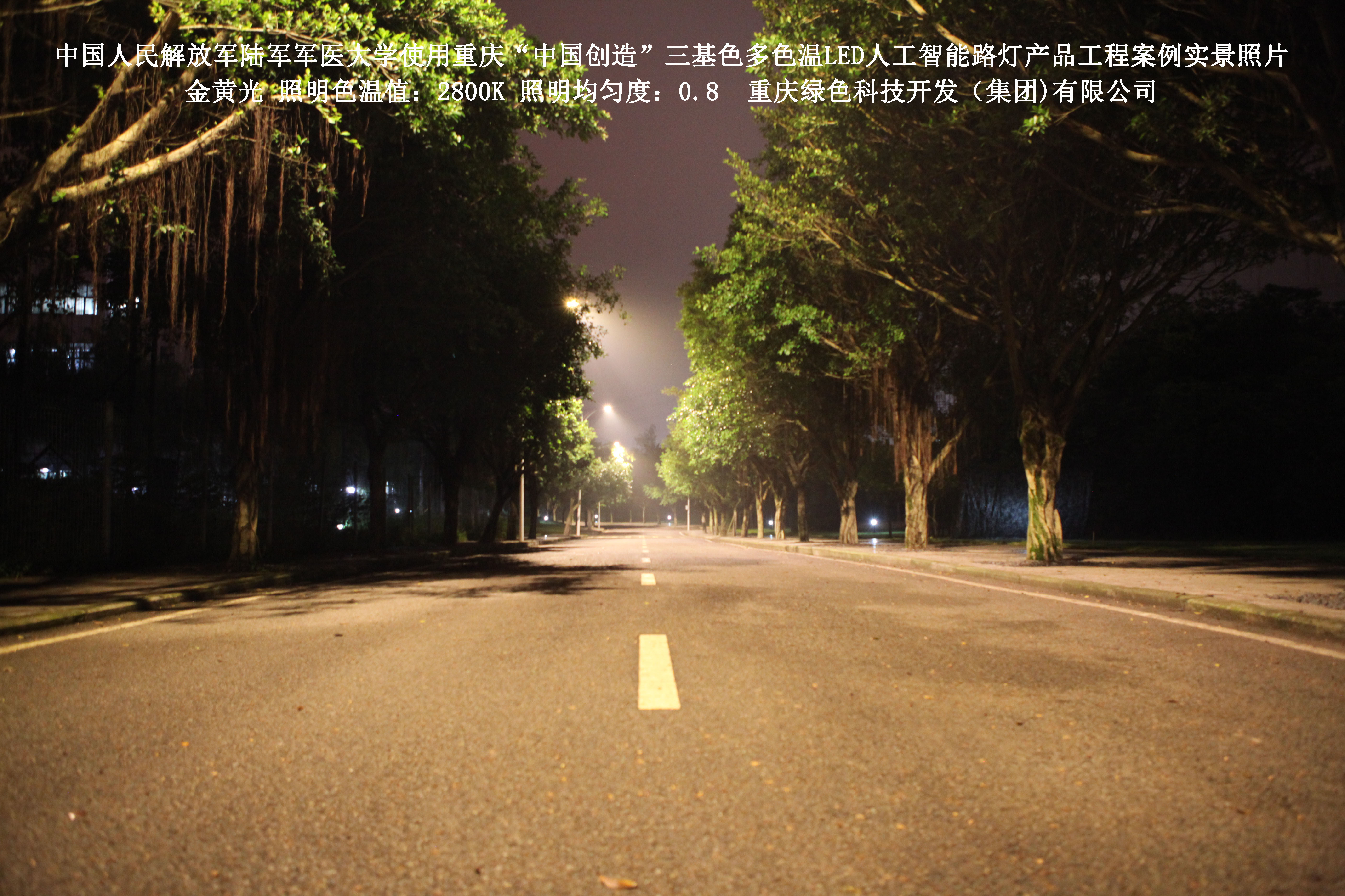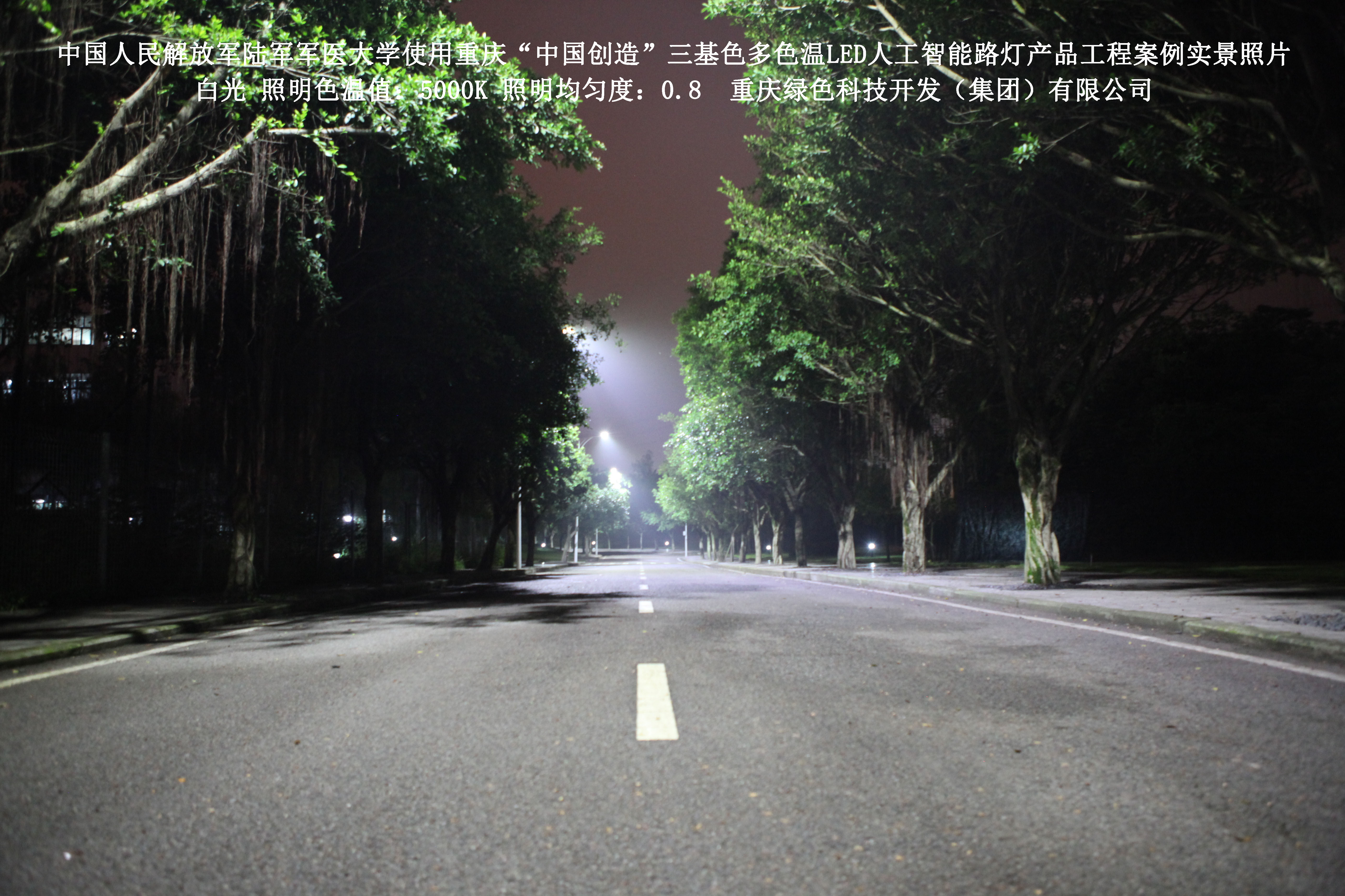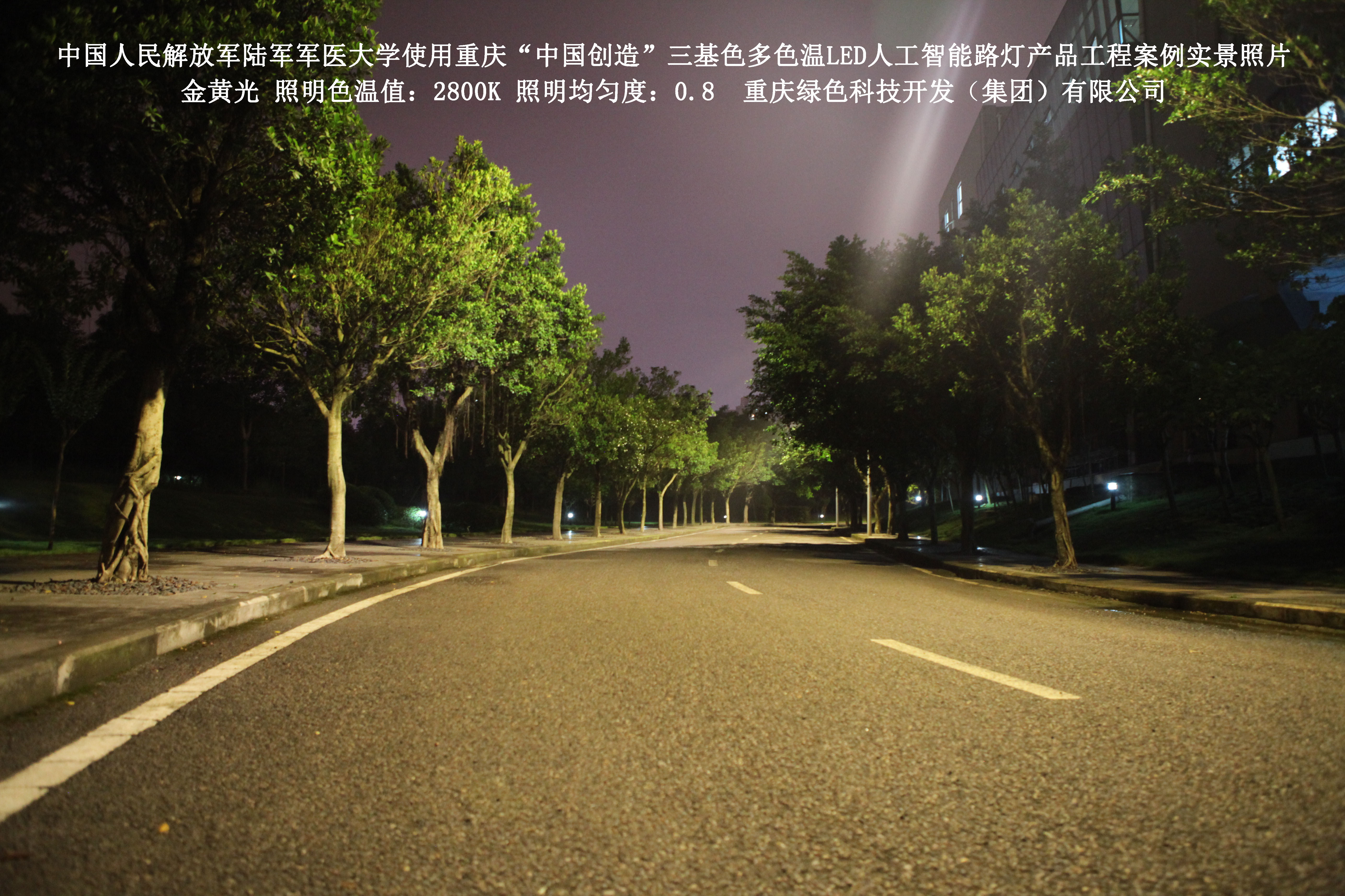 2018年4月,中國人民解放軍陸軍軍醫大學使用了我司研發制造的重慶“中國創造”三基色多色溫LED人工智能路燈,對沙坪壩大學城校區道路實施了綠色照明科技節能改造工程,該工程已全面竣工。工程實施后,極大地提高了照明清晰度、燈光均勻度、舒適度,實現城市路燈照明系統的智能化管理。