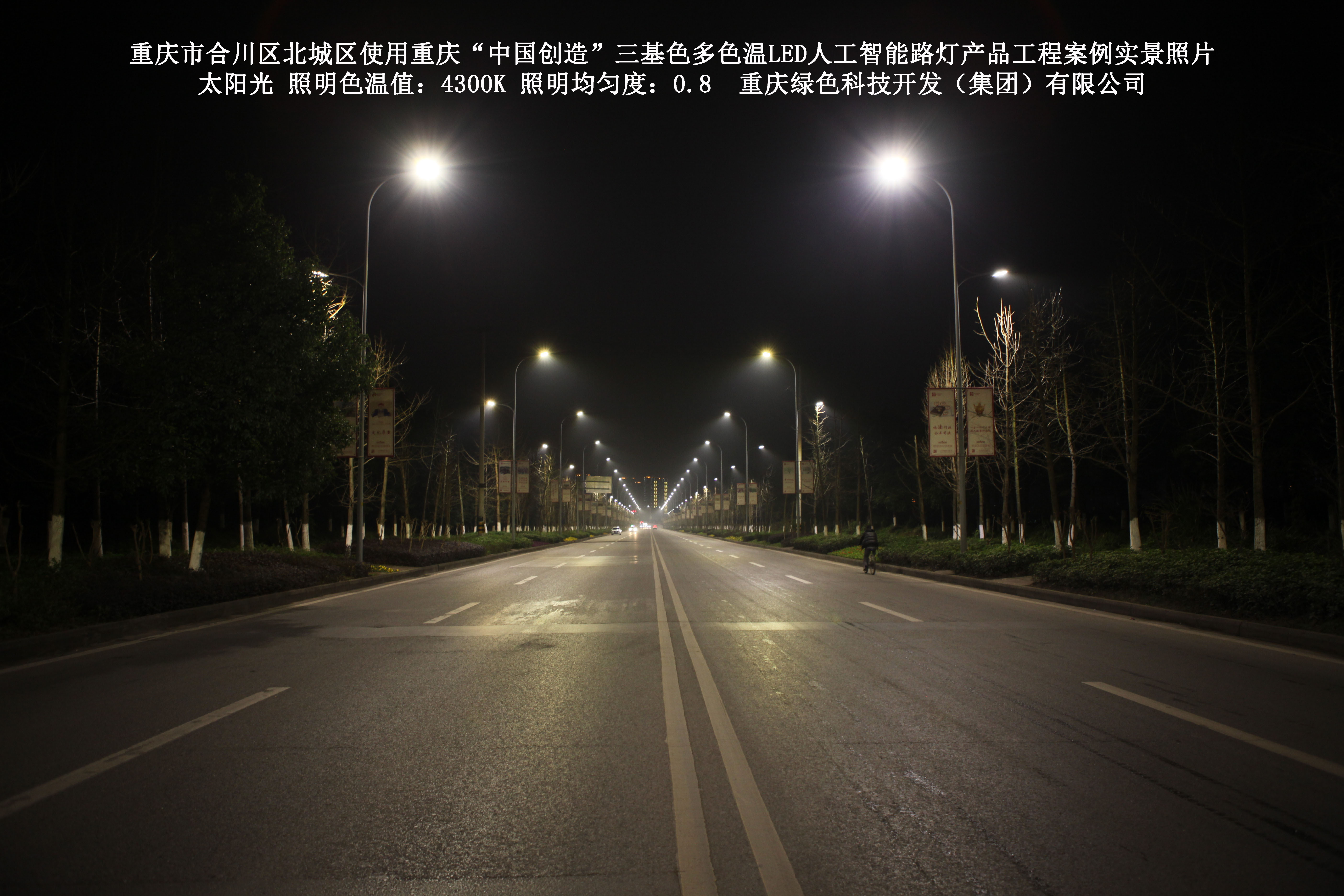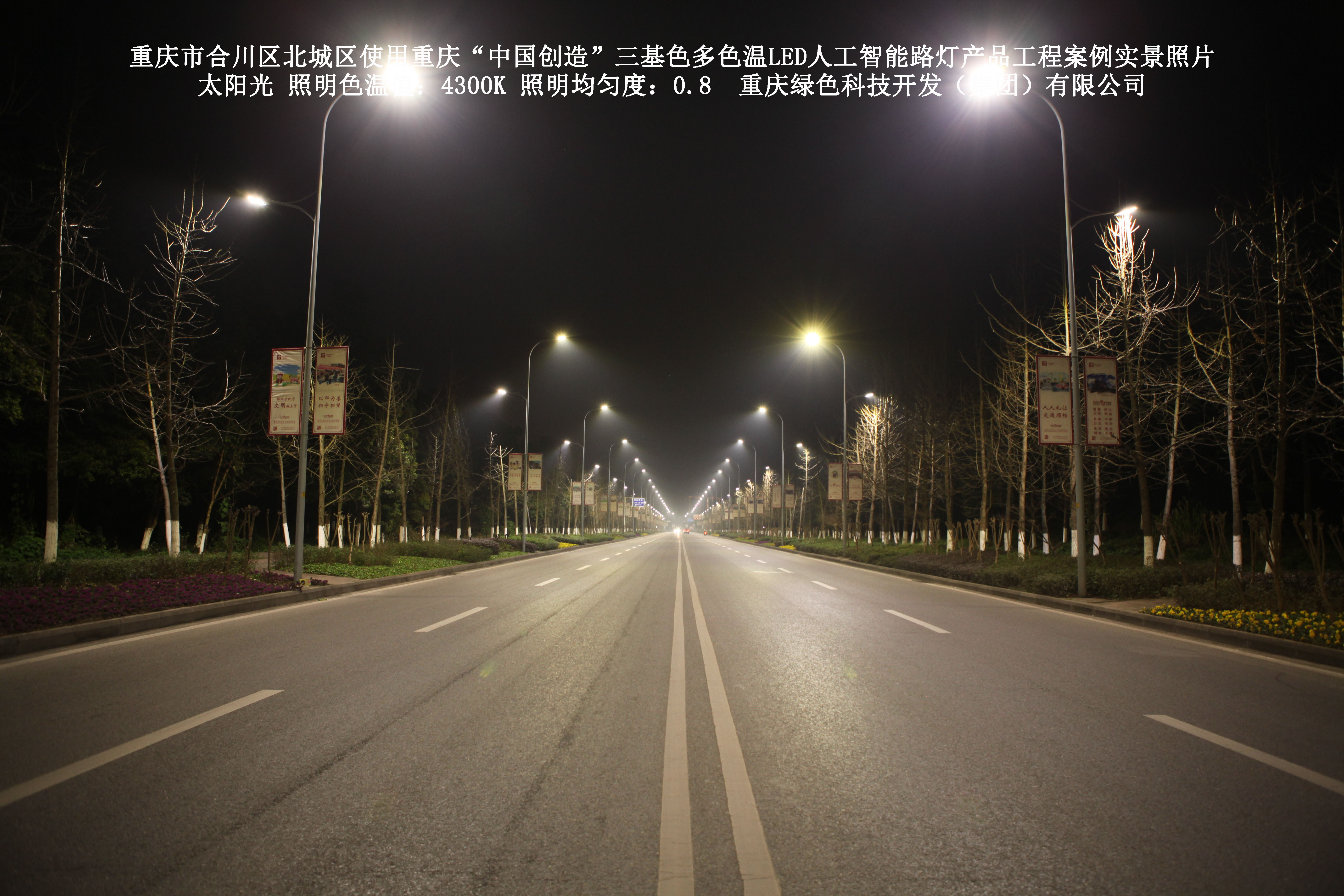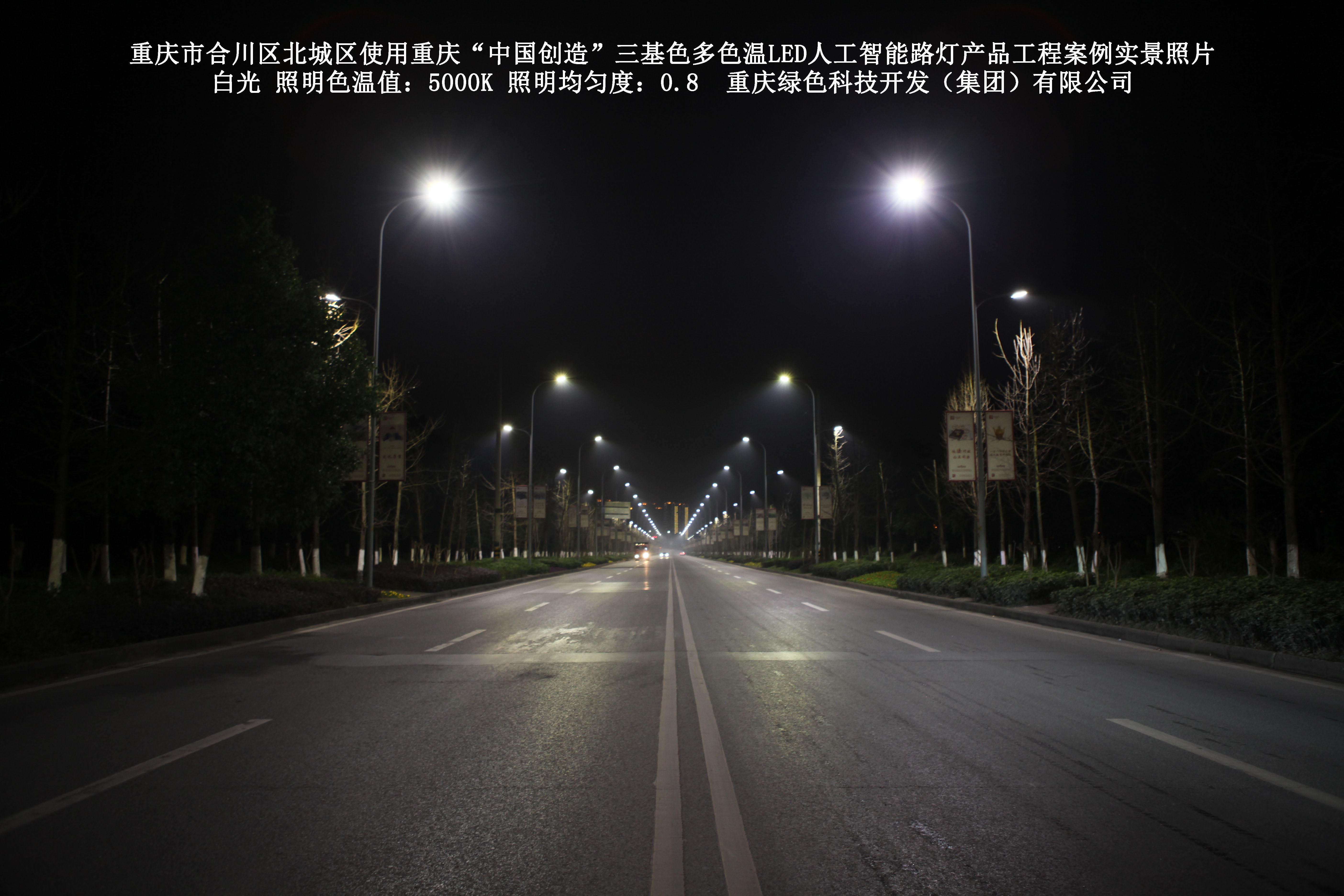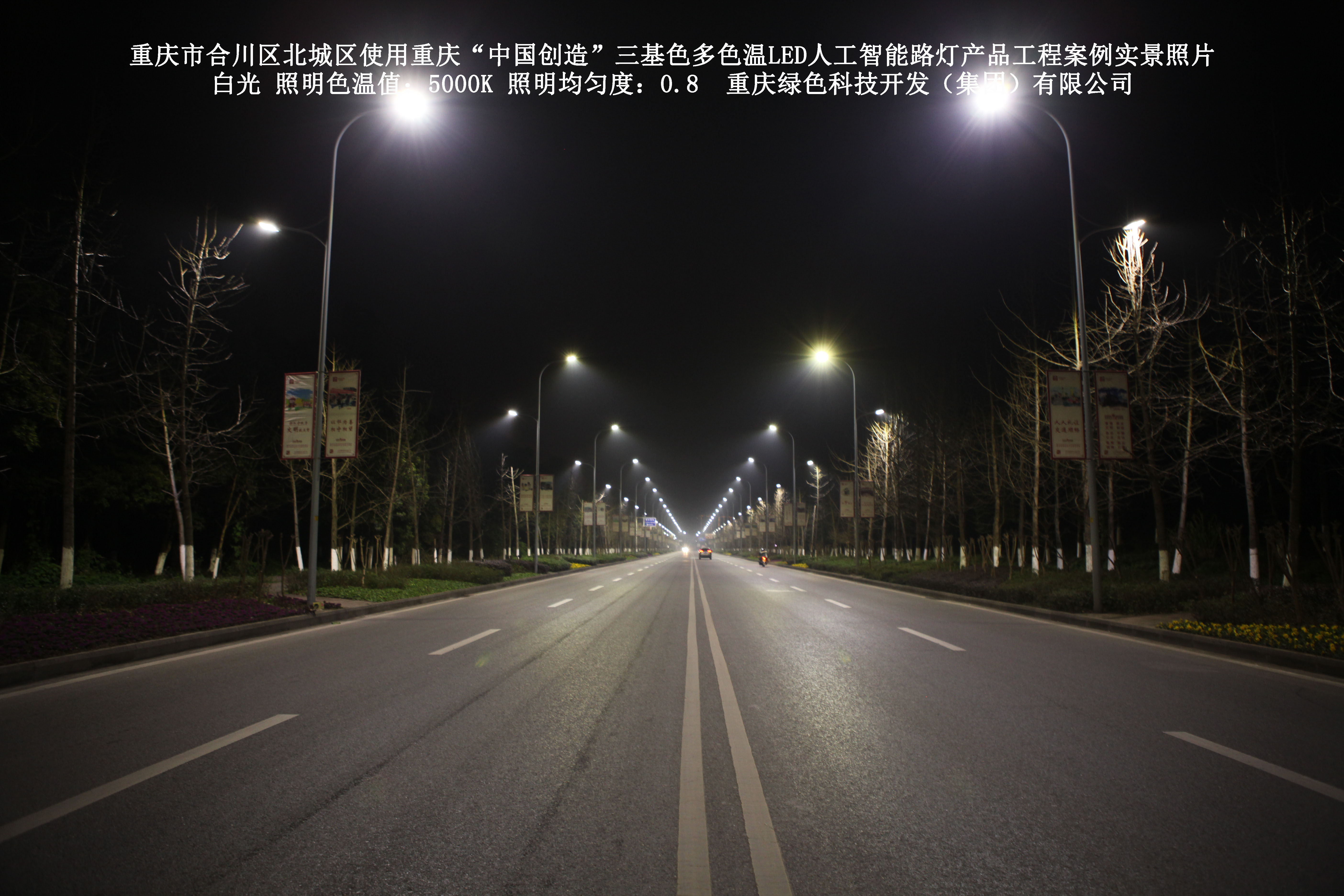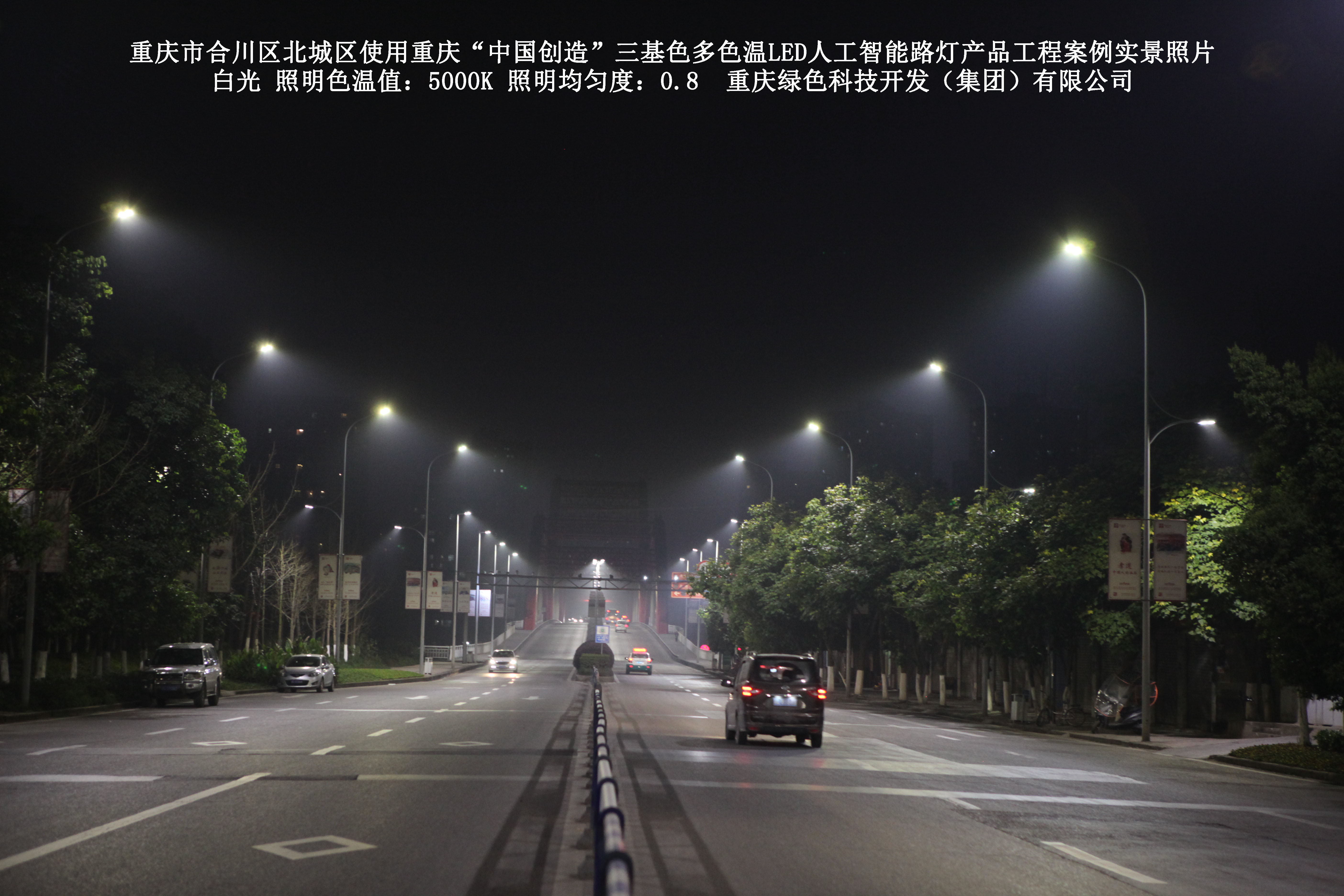 2019年1月,重慶市合川區城市管理局使用了我司研發制造的重慶“中國創造”三基色多色溫LED人工智能路燈5144盞,對合川區北城區實施了綠色照明科技節能改造工程,該工程已全面竣工。工程實施后,極大地提高了合川區北城區城市照明清晰度、燈光均勻度、舒適度。通過智能終端實現單燈感知、線纜防盜報警,與原高壓鈉燈相比,節能率60%以上,有效解決了關閉控制回路或間隔關燈方式造成的照明暗區,確保行人和車輛通行的安全,實現城市路燈照明系統的智能化管理,推進了智慧城市建設。