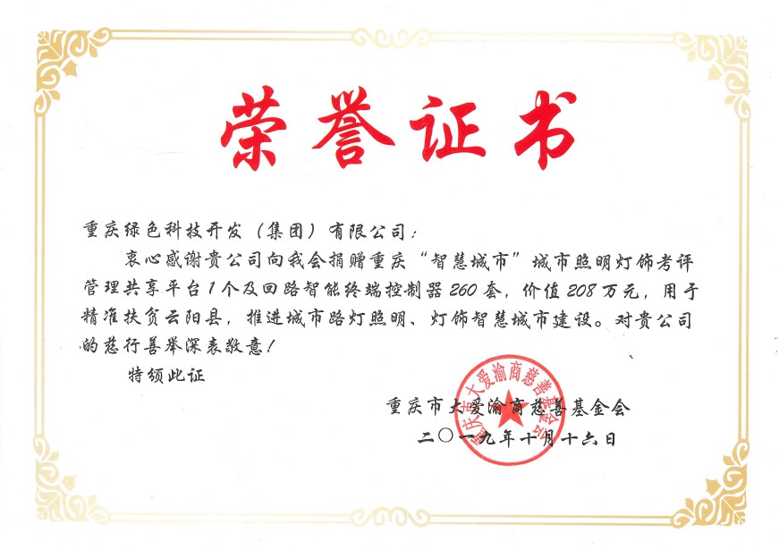 10月16日,重慶綠色科技開發(fā)(集團(tuán))有限公司為支持國家級(jí)重點(diǎn)貧困縣精準(zhǔn)扶貧工作,積極推進(jìn)智慧城市建設(shè),通過重慶市大愛渝商慈善基金會(huì),向云陽縣市政設(shè)施管理所捐建了回路智能終端控制器260套,以及配套建設(shè)重慶“智慧城市”城市照明燈飾四級(jí)考評(píng)管理共享平臺(tái)1個(gè),總價(jià)208萬元,用于解決云陽縣城市路燈照明智能化管理的問題,幫助云陽縣實(shí)現(xiàn)市政府在《重慶市城市綜合管理提升行動(dòng)方案》提出的城市照明“一把閘刀”管理的要求。